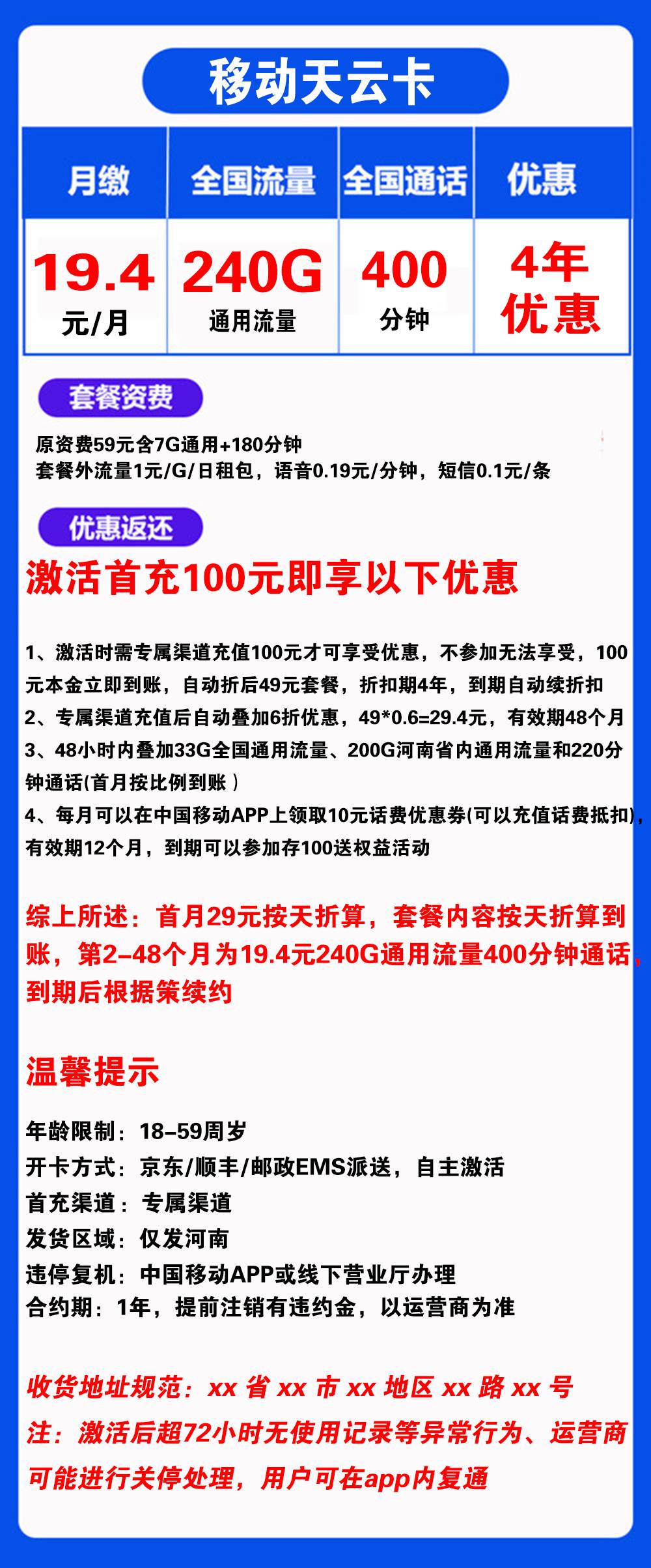 H1870/移动天云卡19.4元240G流量+400分钟通话【仅发河南】