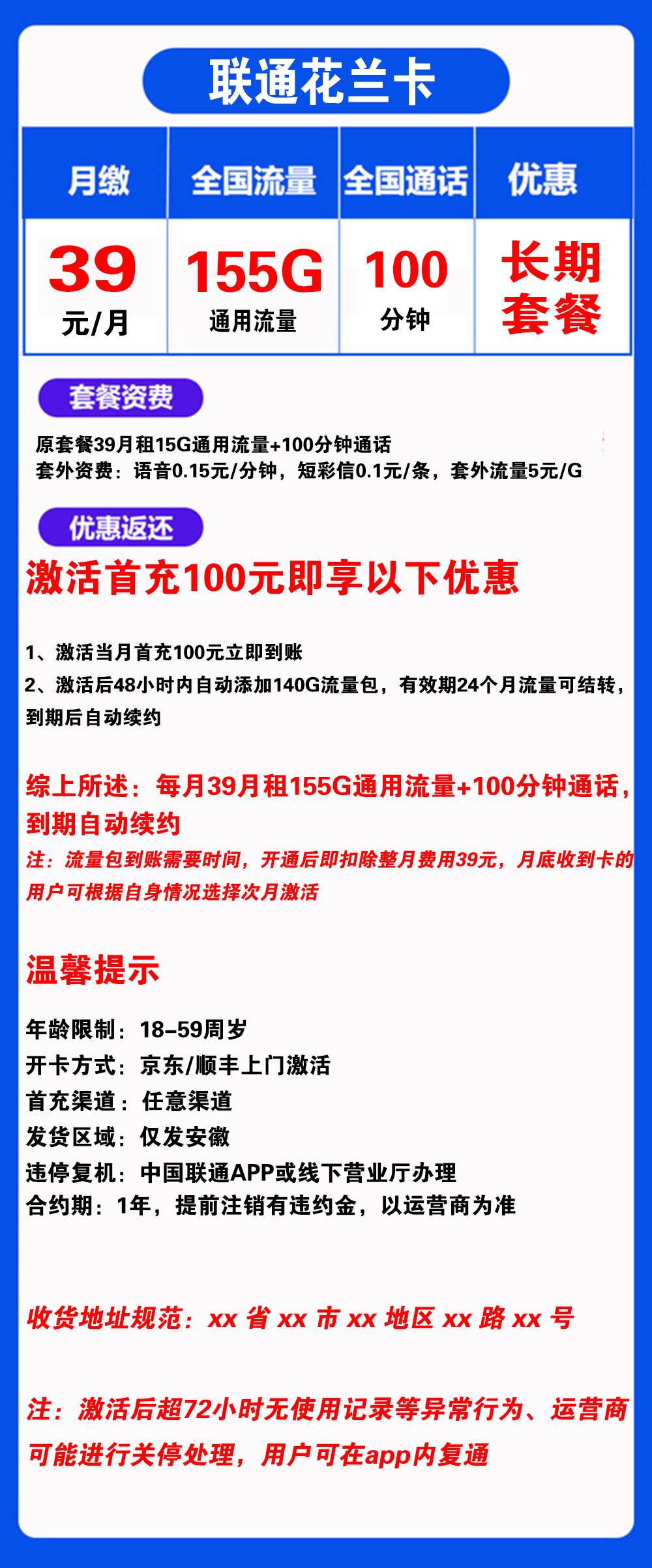 W1869/联通花兰卡39元155G流量+100分钟通话【仅发安徽】【长期套餐】